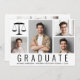 Modern law school graduation announcement featuring an illustration of the scales of justice, a 4 picture photo collage, "Graduate" written across the bottom in large capital letters and his or her name, law school and class year in simple typography. On the reverse side, add an additional photo and personalized message.