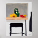 Poster in a modern, Boho style abstract of a tabletop and atool, with a still life arrangement of pitcher and fruit, in shades of soft gray, black and beige, accented with red and golden yellow