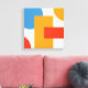 Modern art piece of geometric shapes. Made up of circles and rectangles in blue, orange and red on a white background.