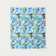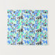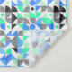 This tapestry features abstract geometric pattern with lines and shapes in black, blue and green shades on white.