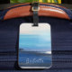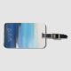 A modern luggage tag design with an abstract paint effect background fading from navy blue, to light blue and then cream. At the bottom, in off white script typography, you can customize with your name.