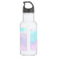 Water bottle with a modern abstract watercolor design. Blue and purple colors mix and mingle together in a soft pastel colored abstract pattern.