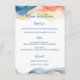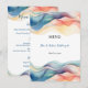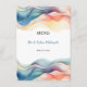 Modern Abstract Wedding Menu designed with a bright color wave both front and reverse. The front text includes: WEDDING MENU, The Bride and Groom's Names and Wedding Date, on a white background. The reverse text includes: Menu Selections, along with your Appetizer, Entre and Dessert Selections, accented with a diagonal color wave on a deep blue background. To personalize this menu, simply insert your Appetizer, Entre and Dessert Selections into our easy template, replacing the sample text. Be sure to view the entire Modern Abstract Color Wave Wedding Collection for matching cards and accessories.