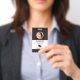 Company employee identification badge with templates created for you. Background is a modern abstract in red, white, and black.