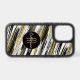 Here's a pretty abstract design that resembles paint brush strokes in black, gray, and white, combined with faux gold glitter embellishment. The stripes are placed diagonally across the surface of the case. At the center is a gold lined black circle banner with your monogram in gold, and your name in white script. *Abstract pattern by ThingsByLary.