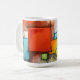 “This modern abstract geometry design turns a simple mug into a statement art piece. Glowing orange, teal and yellow rectangles float over a misty gray background, framed by loose, hand-drawn lines that suggest movement, energy and creativity. The composition feels like a city skyline reimagined as minimalist art.