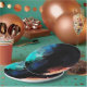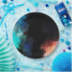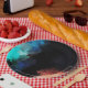 Paper plates with a modern abstract design. Paint splatters and swirling colors in turquoise, white, orange and black with hints of blue.