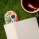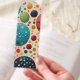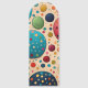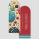 Beautiful rich retro styling and colors of dusky blue, electric blue, dark red, orange, yellow and sage green provide a planetary space look in this abstract polka dots pattern. The back features a three-tone dark red, aqua and beige background for your name and text in beige.