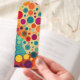 Beautiful rich colors of dark teal, aqua, fuchsia, peach, orange, lemon yellow and purple strike a dramatic pose in this abstract polka dots pattern. The back features a simple fuchsia background for your name and text in peachy orange.