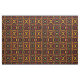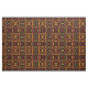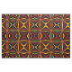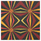 This contemporary fabric design features a repeating modern abstract geometric pattern of the sun and it's rays in colors of red, yellow, gold, orange and brown on a black background.