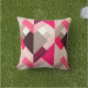 Throw pillow in a Mid-Century Modern design of layered triangles in shades of fuchsia pink, light pink, and stone gray / grey, accented with white