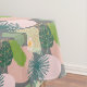modern and trendy abstract tropical foliage tablecloth pattern that features a variety of pastel shapes, tropical leaves and fronds, on a medium gray background.