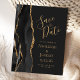 This elegant modern save the date postcard features a black watercolor agate border trimmed with faux gold glitter. The customizable text is gold colored on a charcoal gray background. The reverse side repeats the information, along with a customizable return address.