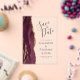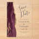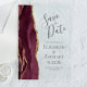 This elegant modern save the date card features a burgundy watercolor agate geode border trimmed with faux gold glitter. The customizable text is charcoal gray on a clear background.