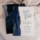 This elegant modern save the date card features a navy blue watercolor agate border trimmed with faux gold glitter. The customizable text is charcoal gray on a white background. The reverse side features a matching navy blue and gold agate design.
