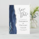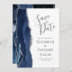 This elegant modern save the date card features a navy blue watercolor agate border trimmed with faux silver glitter. The customizable text is charcoal gray on a white background. The reverse side features a matching navy blue and silver agate design.