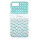 Modern aqua, grey, white chevron and polka dot pattern iPhone 7 plus case. A stylish, elegant, girly design using the classic zigzag stripes and cute polka dots with contemporary yet vintage look in a sense. There is a frame in the centre. You can change background color -turquoise and text color choosing from over 200 colors from Zazzle color chart.