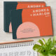 A modern boho wedding envelope giving a bright and fun retro vibe with its groovy arch abstract designs bursting a pop of color orange, dark blue green and peach lettered with bold fonts.