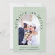 Modern light sage green wedding thank you card featuring your photo in an arched frame, "With Love And Thanks" in elegant typography and first names or married name, wedding date and location. On the reverse side, personalize your thank you message in simple typography, add an additional photo and your names in a signature-like script.