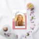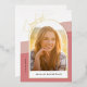 This stunning gold foil graduation party invitation features an arched photo on the front and a second one the back. The design is accented with a rose colored wavy shaped background. The word "graduate" appears in a gold foil modern script. The arched photo, on the front, offers a gold foil border. Custom text, on the back, allows you to add your party invitation details.