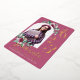Modern photo graduation announcement features a vertical photo in a unique arch layout on a purple background and a bouquet of purple flowers personalized with your photo, name, school, and year. Add a personal message to the back.