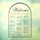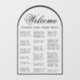 A simple transparent alphabetical seating chart inside a modern arch frame. The text and the frame are black. The Welcome is written in an elegant calligraphy. The names are on 3 columns.
