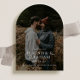 Elegant modern minimalist simple save the date featuring a photo backdrop, white text overlay and arch shaped card.