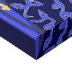 Modern and decorative digital artwork in expressive and bold colors representing a night scene with the Moon seen from a window of an interior with a table covered with blue cloth with botanical pattern, blue curtains with floral pattern, red checkered wall with a sun ornament. A plate with some lemons, grapes and apples scattered on the table, a bottle and a glass of red wine. This genuine artwork by Tanjica is greatly inspired by Henri Matisse and is not a copy of any of his masterpieces.