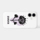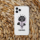 A sleek white phone case featuring a modern, stylized black floral design with abstract petals and stems, set against a subtle lavender teardrop background. Below the flower, the name "SANDRA" is printed in bold, artistic lettering, making it a personalized and elegant accessory.