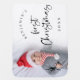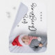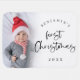 Modern Baby 1st Christmas Script Name Year Photo. A fun set script for First Christmas and the rest of the text is easy to personalise with your baby's name and the year. Replace the sample photo with your own. A gradient overlay layer is on top of your photo so it fades out as it reaches the center with the text partially overlaid on top. You can coordinate the color on the back with your photo via customise further.
