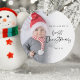 Modern Baby First Christmas Name Year Photo. Great to commemorate your baby's first Christmas and a keepsake for Christmasses to come too. A beautiful set script for First Christmas and the rest of the text is easy to personalise wikth your baby's name and the year. Replace the sample photo with your own. A gradient overlay layer is on top of your photo so it fades out as it reaches the center with the text partially overlaid on top. The same design is also on the other side and words and photo will update simultaneously as you make your changes.