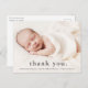 A sweet photo thank you birth announcement featuring modern thank you and full bleed horizontal photo. The back is a mailable postcard with a personal message from the family.