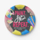 Get your paint and sip bachelorette party started right with art-themed plates which you can use for either food or as a paint palette. Simply customize with the name of the bride and date for a fun personal feel. Design features typography script "paint sip repeat" as well as paint splatters complete with pink, yellow and blue paint splatters as well as hand painted paint palette, glass and paint brushes against a chalkboard background.