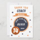 Modern Basketball Ball Thank you Coach Card. A modern personalized thank you coach card with a basketball ball, coach's name on the ribbon, team name, player's name and number. You can change any text on the card.