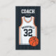A modern business card for a basketball coach. The front of the business card design features the title COACH in large bold letters. It shows an illustrated vector design of a basketball jersey, including the team name and jersey number, which can both be personalized. The back of the coach business card design include the name and contact details. Font style, color size can be personalized using the full Zazzle editor.
