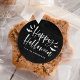 Festive and fun Halloween stickers featuring “Happy Halloween” in a white, hand-lettered modern script font, accented by flying bats on a dark chalkboard background. Personalize these custom Halloween stickers with your name or other custom text. Perfect for sealing envelopes, decorating Halloween party favors, and adding a festive touch to gifts, treat bags, and more.