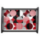 This serving tray features a modern Bauhaus pattern in red, gray, white and black for a contemporary look.