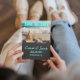 Modern, vertical non-traditional Save the Date announcement features beach scene (that includes waves and starfish in the sand) photography background with Save the Date in aqua blue neon. Personalize with wedding couple's details on dark gray background.
