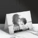 The card shows an example image of a loving couple standing by the sea. A man with long curly hair, a denim shirt and waistcoat is kissing the forehead of a lady with short wavy hair wearing a chunky knit jumper. The photo is taken in sepia monochrome for a classic look. This images is designed as a placeholder to be replaced by your favourite photo or family picture.