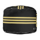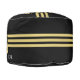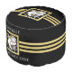 The design features a pair of ice skates over a snowflake crest with black and faux gold glitter background. This elegant winter sports design serves as a cool modern and unique round pouf with personalized text.