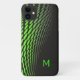 Modern iPhone case done in black with a neon green cascading dot pattern and a single letter monogram. Personalize the initial for yourself or as a great gift idea.