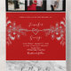 Elegant, modern, vintage, black and red all-in-one wedding invitation with silver rope heart, gilded floral lace and custom four pictures of the couple.