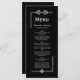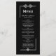 A modern black wedding menu featuring a stylish silver faux glitter border and script text.