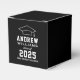 Modern graduation party favor boxes feature a grad cap with simple and white typography design that can be personalized with the graduate's name and school. Black background can be customized to match any school or party theme color.