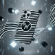 Featuring a bold black and white diagonal striped pattern, this design is centered with a classic circular monogram badge.