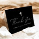 This simple and elegant baptism thank you card features a classic white cross and “Thank You” in casual calligraphy on a black background for a timeless black and white look. The front can be personalized with your child’s name, creating a meaningful and polished way to express gratitude after their Baptism or Christening. Inside, the folded card showcases a horizontal photo with your custom message displayed below, making it a beautiful keepsake for family and friends. This versatile design is perfect for both boy and girl Baptisms and coordinates well with traditional and modern church celebrations.
