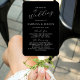 This elegant, modern wedding program fan features white text on a black background. The titles and subtitles appear in beautiful calligraphy script, with the couple's names in serif and the remaining text in sans serif font.