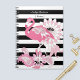 The product design features a flamingo with kaleidoscopic paisley patterns in shades of pink over black and white stripes background. This tropical bird design with personalized text makes a modern and unique notebook.