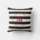 A modern geometric Throw Pillow with Black and White Stripes and red Monogram.