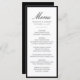 This wedding menu features “Menu” displayed in elegant black calligraphy script with the couple’s names, wedding date, and menu selections arranged below in refined serif lettering. A bold black border frames the design, creating a clean and structured presentation that feels timeless and sophisticated. The balanced layout offers a polished way to showcase your reception courses, making this menu card ideal for modern, classic, and formal wedding celebrations. Personalize the text to create a cohesive table detail that complements an elegant wedding setting.